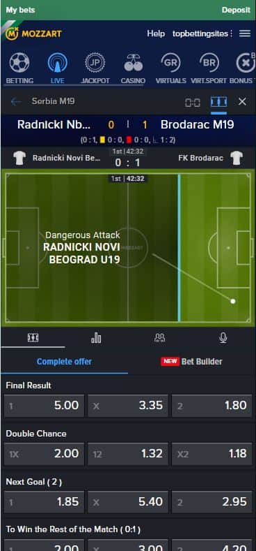 Now we are going to look at the in-play (also known as live) betting section. Mozzartbet can have between 20 and 40 live football games available throughout the day. The number of open markets, depending on the league or tournament, can drastically vary. Nevertheless, some games will have over 150 markets open consistently throughout the game. Betting is usually open until the very last minutes of every game.